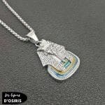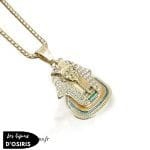 L’Amulette Pharaon d’Égypte est un bijou unisexe conçu pour les hommes et les femmes. Elle se compose d’une chaîne de 60 cm et d’un pendentif de 51 x 26,5 mm. Ce pendentif méticuleusement détaillé représente une tête de pharaon arborant une fausse barbe tressée, symbole de sa divinité et de son éternité. Un pharaon n’apparaissait jamais en public sans sa coiffe traditionnelle, décrite ici avec des pierres scintillantes, améliorant l’éclat de ce précieux bijou d’inspiration égyptienne. La coiffe est surmontée d’un serpent, l’uraeus, un cobra femelle qui protégeait le pharaon de ses ennemis. Enfin, sous la tête royale, un ornement présente des couleurs vives et harmonieuses : bleu, rouge et vert.